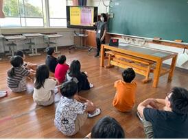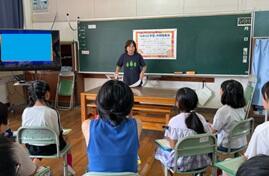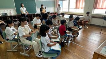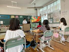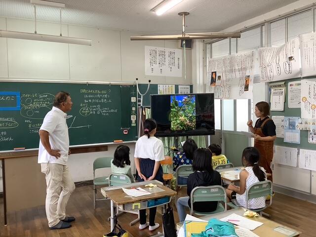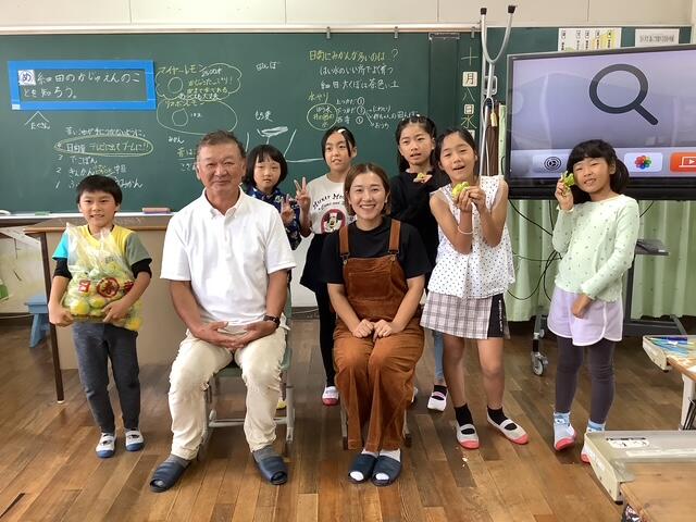 3・4年生が、下塚田の果樹園に見学に行く予定をしていましたが、朝の雨で見学を中止にしましたとても残念でしたが、果樹園から作本さん親子が来校してくださり、子ども達の疑問・質問に答えてくださいました。