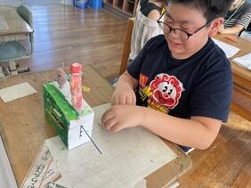 何やら、箱と紙粘土を使って工作中です。 クランクの仕組みを使って、動くおもちゃを作っているようです。