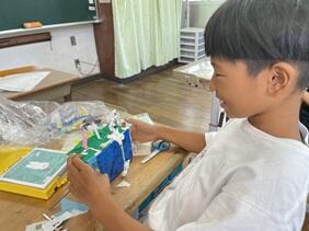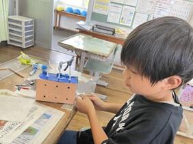 みんないろいろと工夫をして工作していました。自分の作品を見て、時々動かしたり、出来栄えを確認したりしながら、とても楽しそうです 動かして見せてもらいましたが、おもしろい動きをするものもあり、思わずこちらも笑ってしまいました