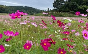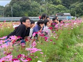 自分達の手で蒔いた種が、どのくらい成長してどのくらい美しい光景をつくっているのかを確かめるためです。現地では、ちょうど最盛期のコスモスの花が一面に咲いていました