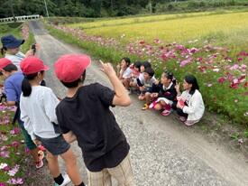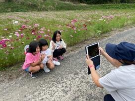 子ども達は、持って行ったタブレットで写真を撮ったり、花を手に取って観察したり、周囲の様子を歩いてみて回ったり、、、自分達が直に蒔いた種のその後を、実感できたと思います みんなうれしそうな表情です