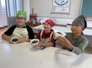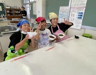 初めに、農政振興局の方から講義をしていただき、その後は、婦人部の方がカツオのさばき方のデモンストレーションをしてくださいました。その後は2つのグループに分かれて、子ども達が丸ごと1匹のカツオを、交代交代で直接包丁でさばいていきました。今では、このような体験ができる機会はとても少なっています。地域の人と関わりながら、地域の港に上がったカツオを使って、最後は「づけ丼」に仕上げ、みんなで美味しくいただきました 日南のカツオ漁について探究していく単元の一部が本日の体験活動でしたが、子ども達の中に様々な気付きや発見があったと思います。次の学習にうまくつなげていってほしいものです。