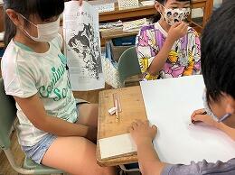 本日の1・2年生の図工です。それぞれクレヨンで描いた絵に、これから水彩絵の具を使って色をつけていきます。