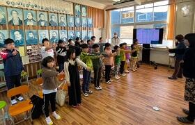 1校時に、全校合同音楽で、「音楽発表会」がありました。始めに、音楽担当の外山先生と一緒に、ウォーミングアップの体操をして、それから、低学年→中学年→高学年へと発表が進み、最後は全員で「虹」という歌を歌って終わりました。 音楽っていいですね!! 子ども達の歌声が室内に響き、合奏や手拍子の音が響き渡り、感動で心(ハート)が気持ちよく震えました