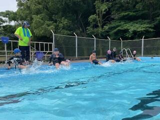 それからは、水に慣れる運動をして、それぞれの学年部に合わせた運動をしました。1・2年は顔を水につける練習やバタ足です。3・4年は伏し浮きやバタ足、5・6年は伏し浮き、バタ足、面かぶりクロール、クロールと進みました。