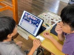 今日はその1番バッターで、1・2年担任の愛甲先生が、生活科の授業を公開しました。子ども達が校内で見つけてきた生き物を、住んでいる環境で分類する授業でした。「Wチャート」という思考ツールを使い、写真で記録していた生き物を、タブレット上で「土(地面)、木、草花、空、水」の5つの場に分類します。2年生が1年生を上手にリードしながら話し合って分類し、発表も2年生がお手本を示していました。1年生は、2年生からいろいろなことを学んでいます☆☆☆