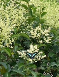正面玄関の前には小さな池があり、今は使っておらず雨水が少し溜まっているだけなのですが、そのすぐ横に生えている木の花に、蝶や蜂、小さな昆虫たちが舞い飛んでいました。写真では分かりづらいかもしれませんが、飽きずにずっと鑑賞していることができます(^^♪ いろんな種類のトンボもいます。