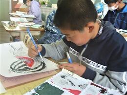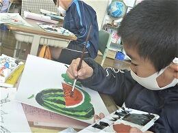 本日の5・6年生の図工では、本物のスイカそっくりの絵を製作しています。