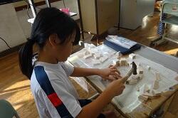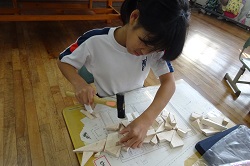 木材を切ってそれぞれの発想で、釘やボンドを使って組み立てています。