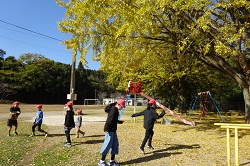 昼休み、黄色の葉っぱの絨毯の上で遊ぶ子どもたちです。