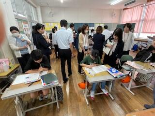 これまでに学習したことをもとに、筆算や計算の仕方を子ども達が考えて自力で問題を解き、ペアで教え合ったり、先生とまとめをしたり、練習問題を解いたりする様子を見てもらいました。たくさんの先生方に囲まれ、子ども達はやや緊張気味でしたが、非常に落ち着いた学習態度で、子ども同士の関係性や先生と子どもとの関係性が素晴らしく、とてもがんばって問題を解いていた。などなど、たくさん褒めていただけました!(^^)!☆☆☆