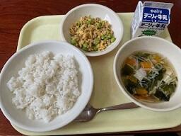 今日の給食は「三食そぼろ丼、わかめスープ、牛乳」です。そぼろは、ご飯にとてもよく合うように味付けされていました(^^♪ わかめスープは、わかめだけでなく「豆腐・かまぼこ・たけのこ・人参・えのきたけ・ねぎ」も入っていて、具だくさんスープでした
