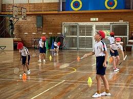 本日のクラブ活動は、バドミントンに取り組んでいます。まずは、ウォーミングアップです。