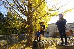 昼休み、黄色の葉っぱの絨毯の上で遊ぶ子どもたちです。