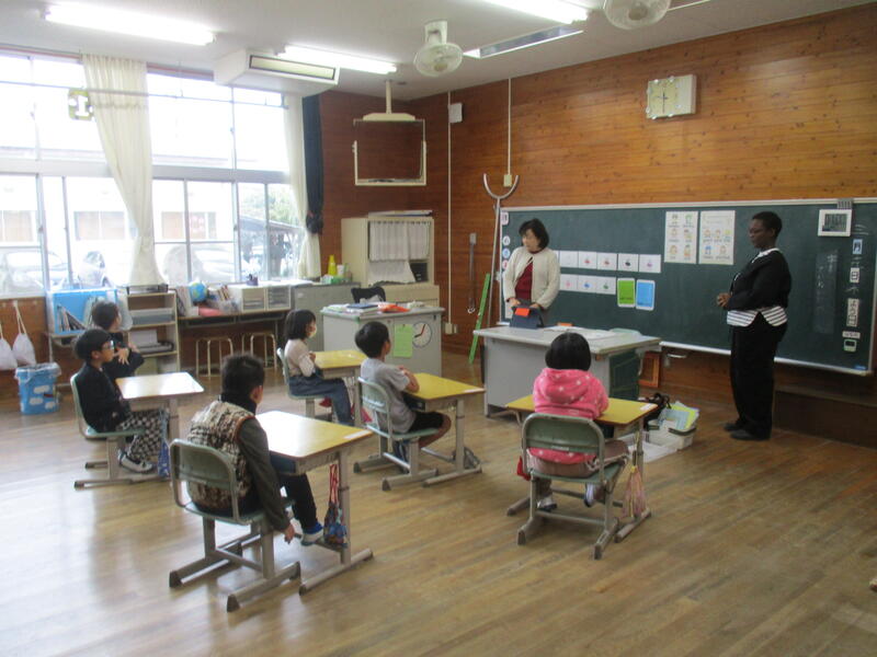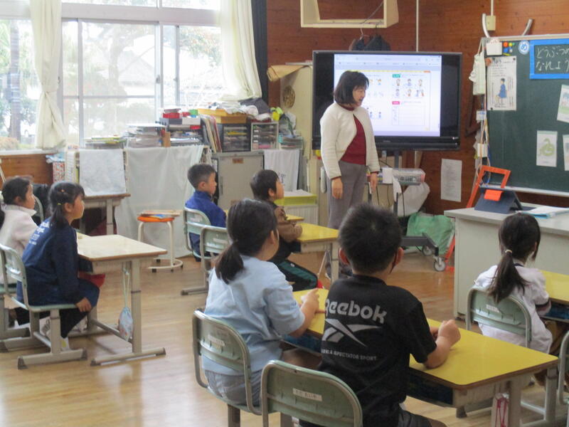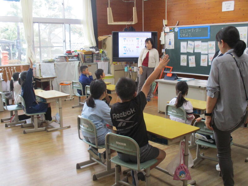 19日に1年生、2年生の学級にALTのカンヤ先生と、外国語専科の大平先生が来てくださり外国語活動を行いました。1年生には色について、2年生には動物について英語で質問して英語で解答する時間がありました。質問内容が理 解できないと解答ができませんが、1年生も2年生も質問内容をよく理解して質問に対して挙手しながら解答していました。子供たちの積極的な姿勢と楽しんで活動している様子が見とることができました。