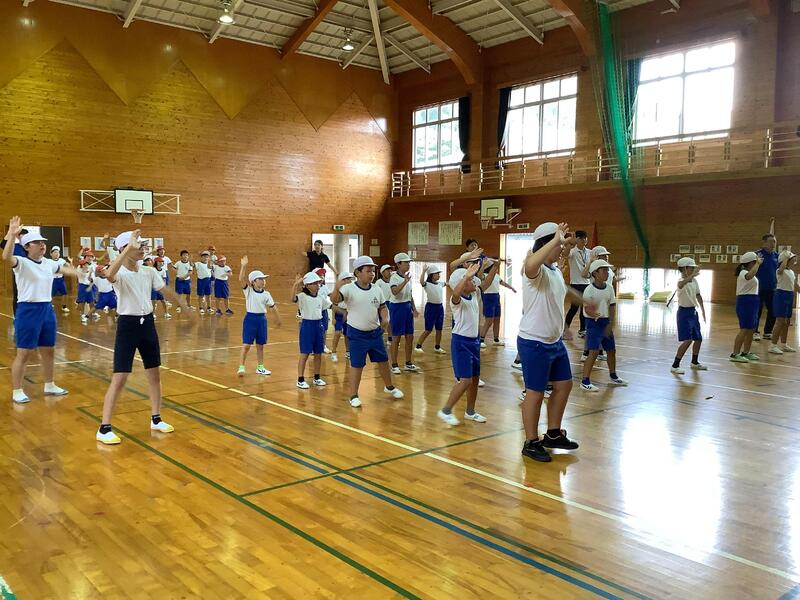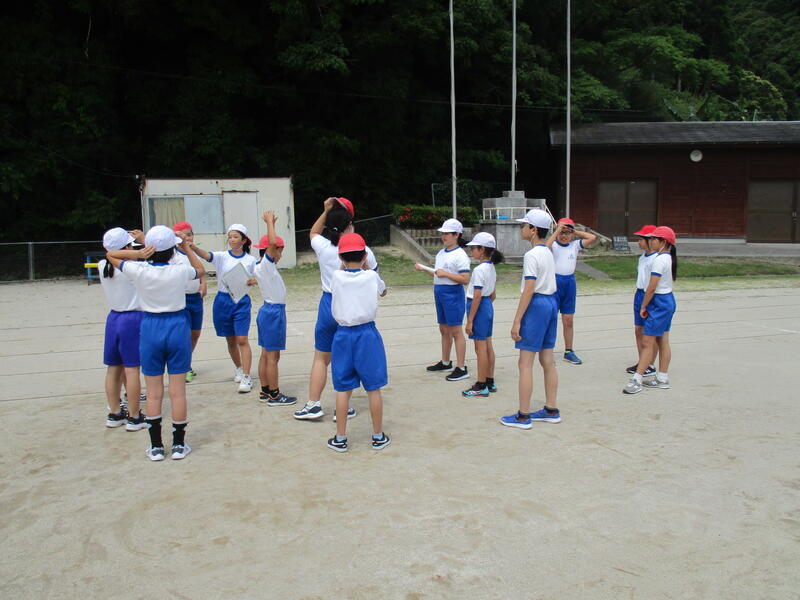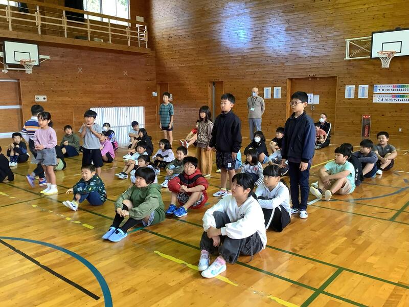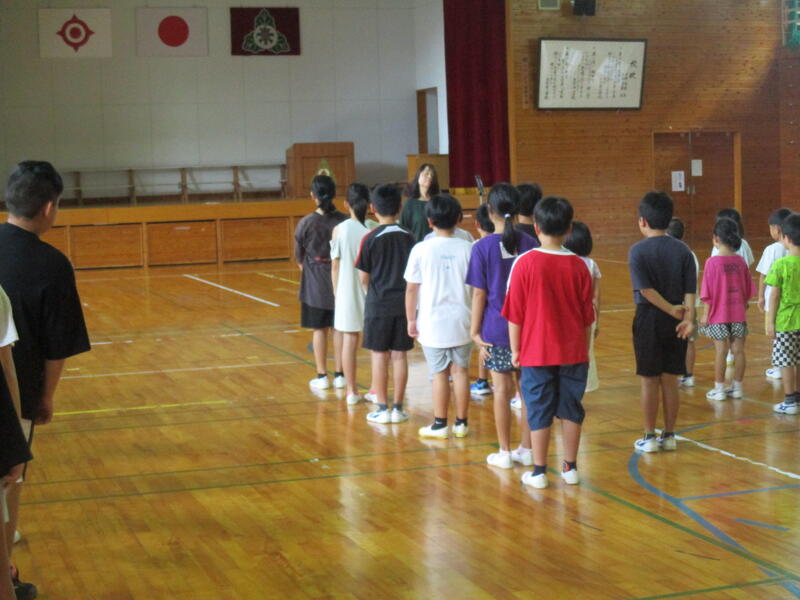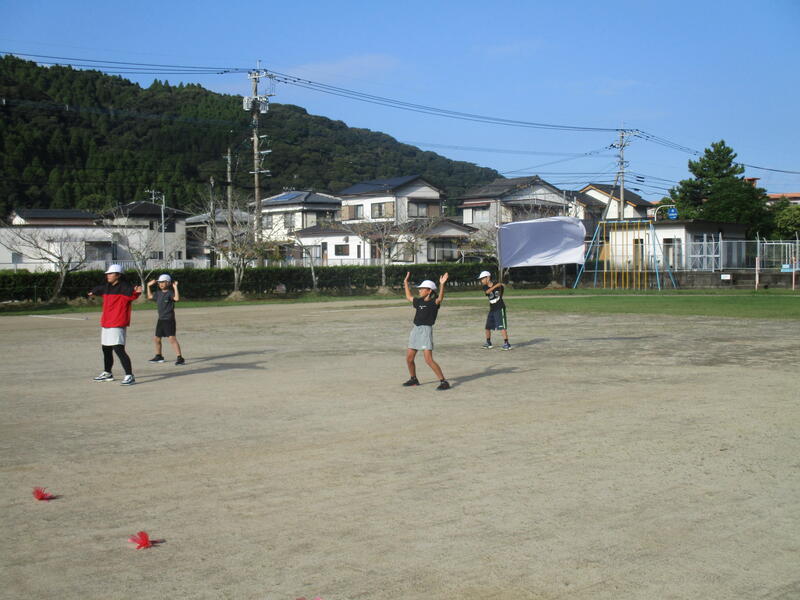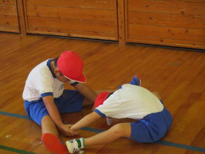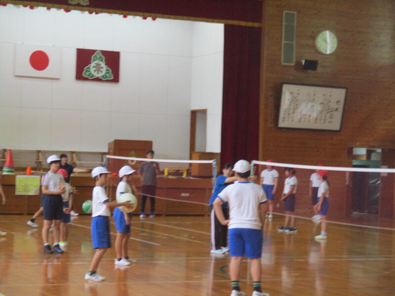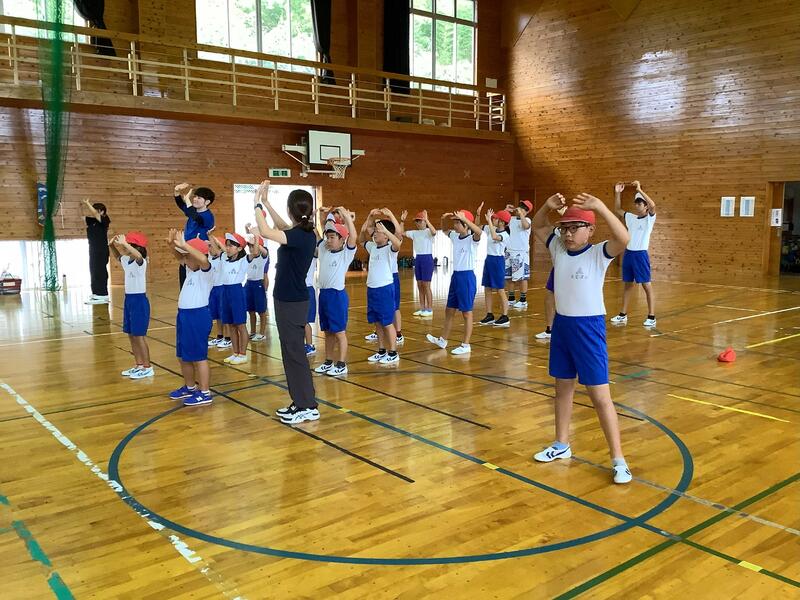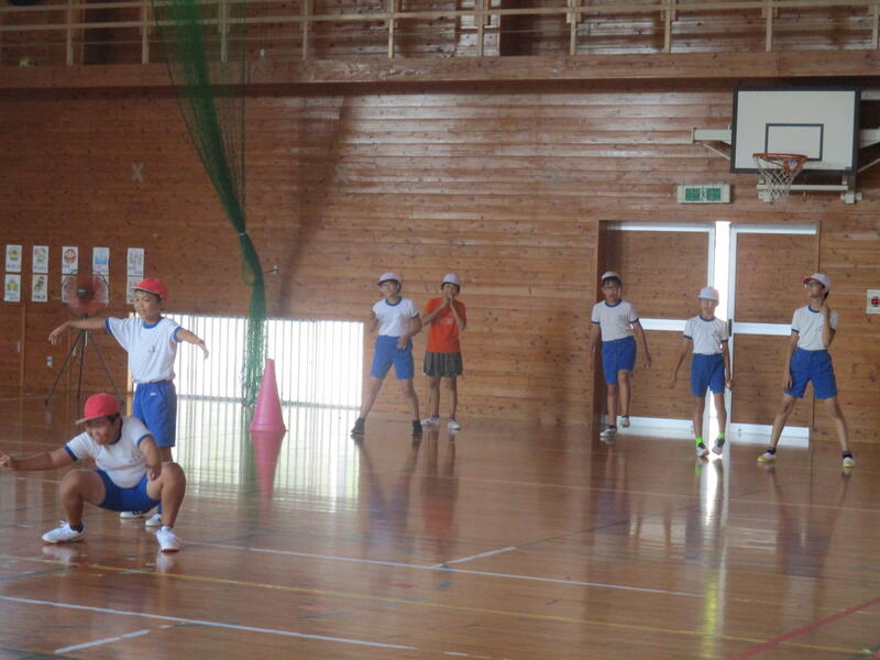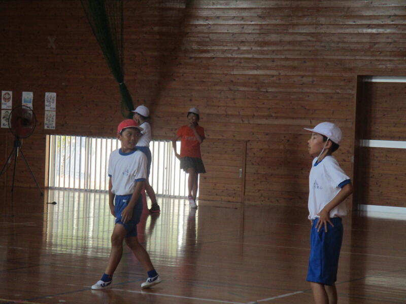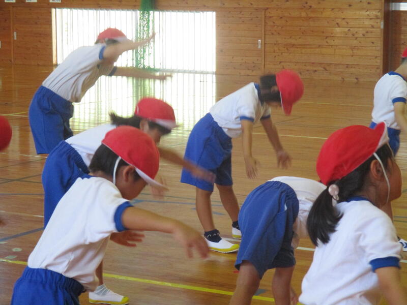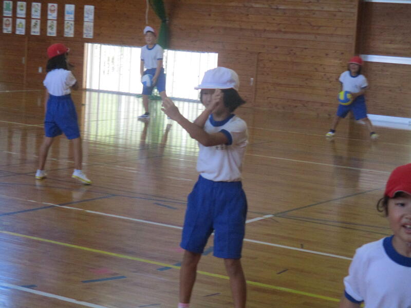 5日は、台風15号も去って晴天でした。そんな中で、1、2年生が体育館で体育の授業を行っていました。今回は体つくり運動で特にボールを投げる運動を中心に取り組みました。最初に全体でラジオ体操を行いました。先生から、腕や足の曲げ伸ばし、指先に力を入れることなどの指導を受けながら上手に体操ができていました。その後、日南市の小学校で行っている「わくわく体操」を全体で行い、ボール投げ運動です。下から両手、上から両手、上から片手など段階的に投げ方の練習をしていきました。とても楽しそうな1、2年生でした。