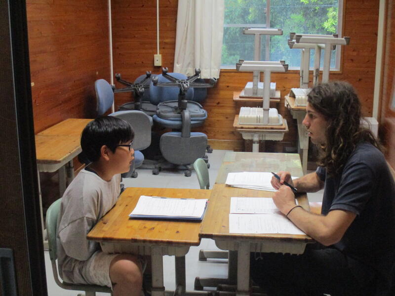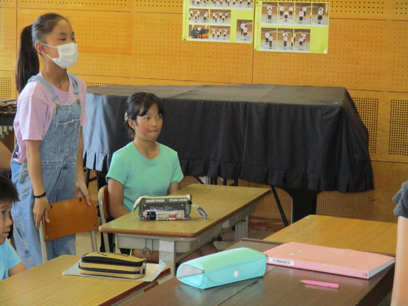 9日の外国語の時間に5、6年生はパフォーマンステストを行いました。その関係で、いつもはカンヤ先生だけですが、ジョージ先生も手伝いに来てくださいました。このパフォーマンステストは、ALTからの英語の質問に英語で返答したり、ALTに英語で質問したりするものです。5年生は自分の好きなもの、欲しいもの、自分の特別な日とその理由、6年生は自分の誕生日と得意なもの、日本にある行事、食べ物、場所、芸能にはどんな物があり、何ができるのかとその感想を伝える内容でした。5年生も6年生もしっかりと準備をして、堂々と回答していました。