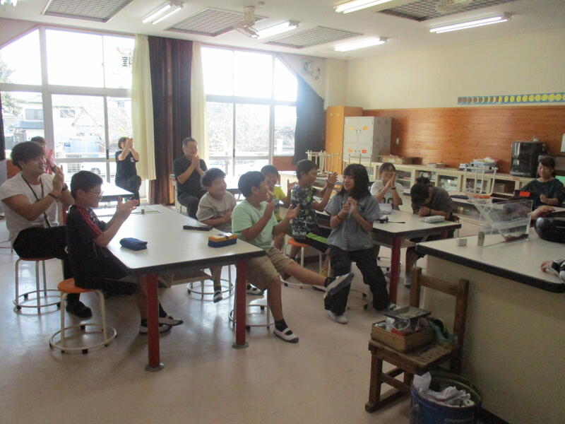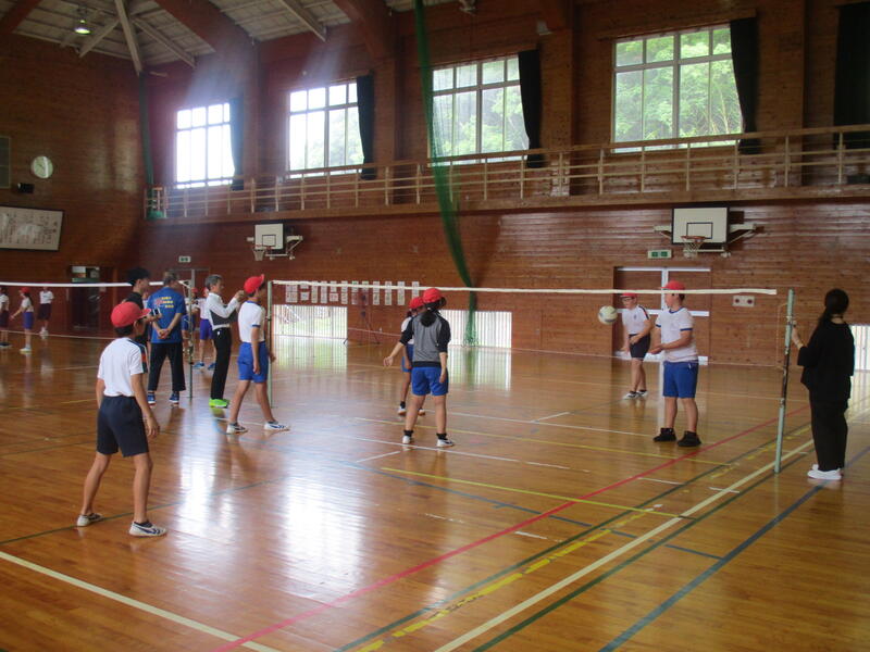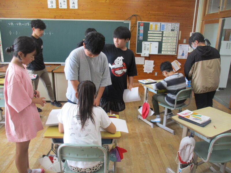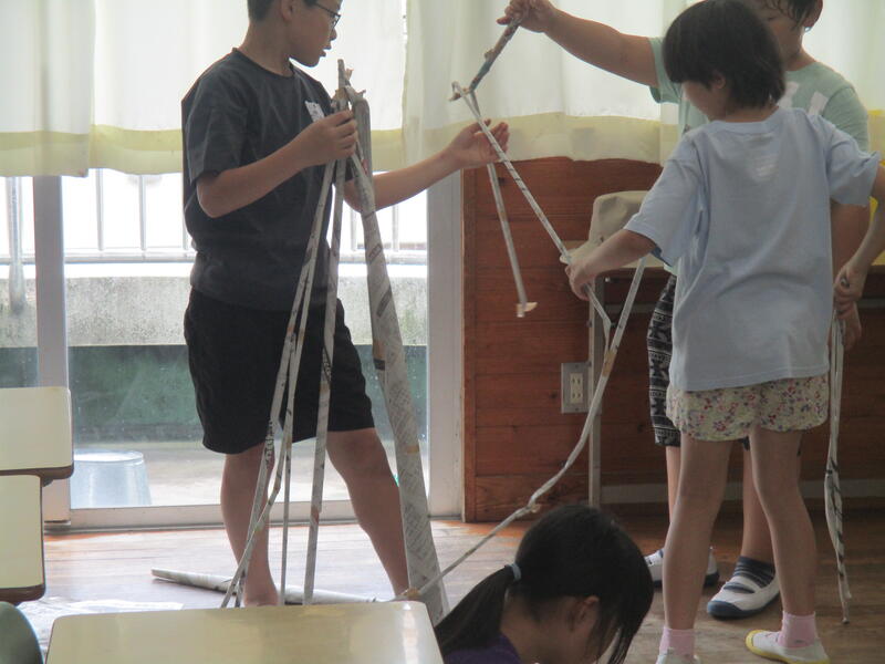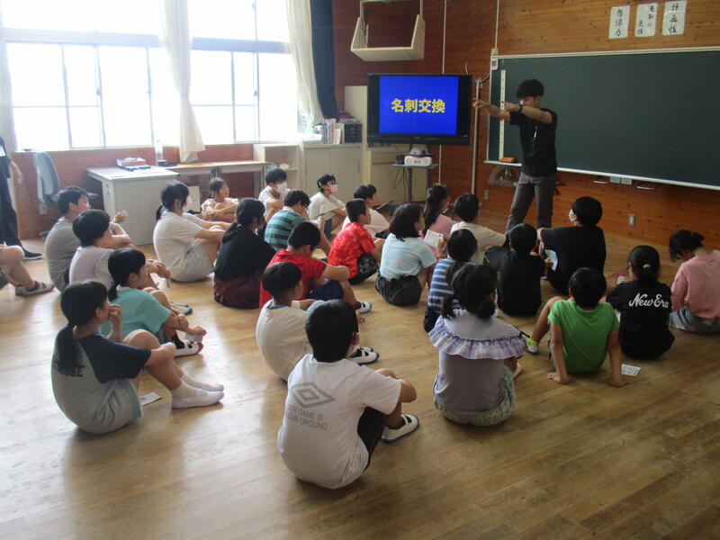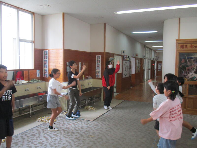 集合学習は、低学年、中学年、高学年に分かれて行いましたが。1・2年生は生活科で、お互いの学校の先生方に関するクイズをしたり、ドッジボールなどを行いながら交流を深めました。3・4年生は図画工作の中で新聞を使って、絶妙なバランスで立っている造形作品を作っていました。5・6年生は体育でソフトバレーボールで楽しんだり、学級活動で自作の名刺を交換やジェスチャーで並び替えを行うゲームをしたりしながら交流を深めていました。全員が満足できた活動だったと思います。