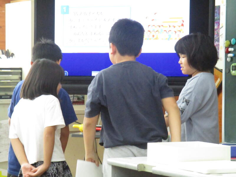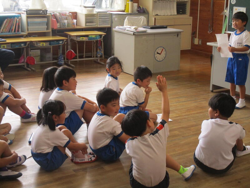 19日は1年生の国語の研究授業が行われました。教材は「サラダで元気」でした。この物語は、主人公のりっちゃんがいろいろな動物に教えてもらいながら美味しくて、栄養満点のサラダを作っていくというものです。今回は、アフリカ象が何をしたのかを考えるという内容でした。子供たちは文章に注目しながらアフリカ象とこれまでの動物の違いを個人で考えたり、全員で考えたりしていました。