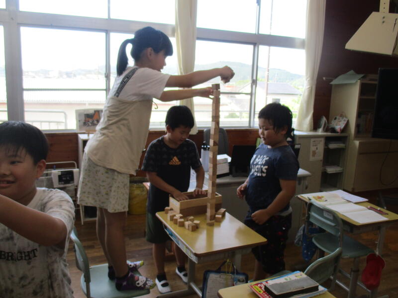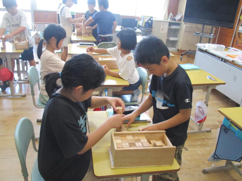 17日の朝の時間に3年生、4年生が日南キューブを使った活動をしました。この活動は、木の匂いや木の感触などに触れるだけでなく、積み木遊びを通して平面から立体的な感覚をつかみ、子供たちの考える力を伸ばすことにつながると思います。この積み木は、1辺3.5cmの立方体が64個で一セットとなっています。子供たちは、友達と協力しながら決められた時間の中でより高く積んでいけるように工夫しながら積み上げていました。バランス感覚も育成されるのだと思います。