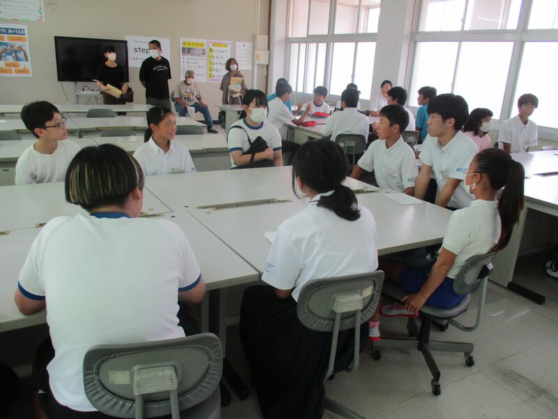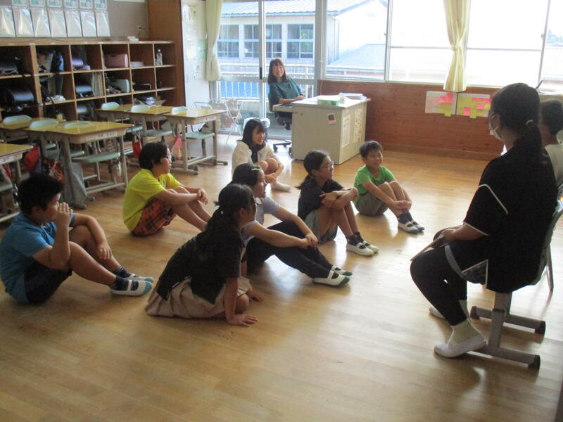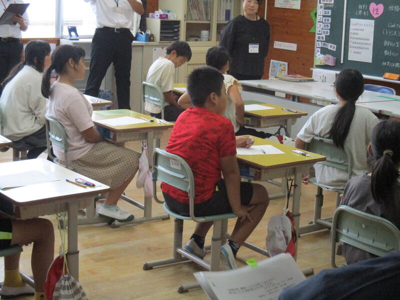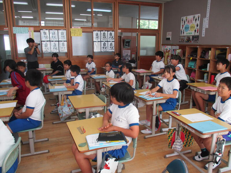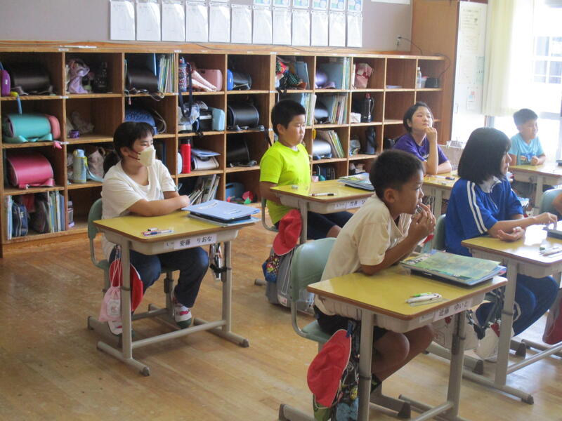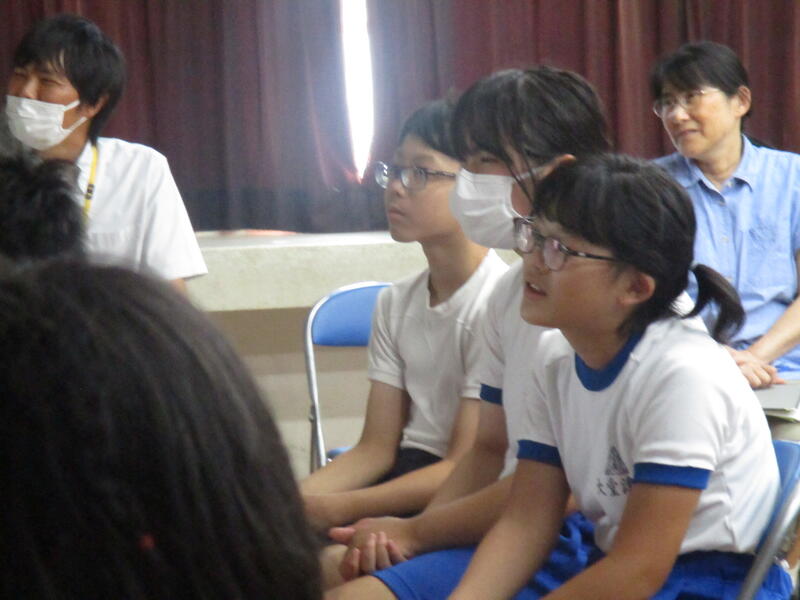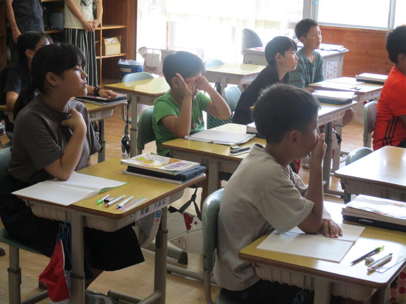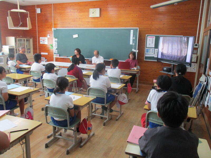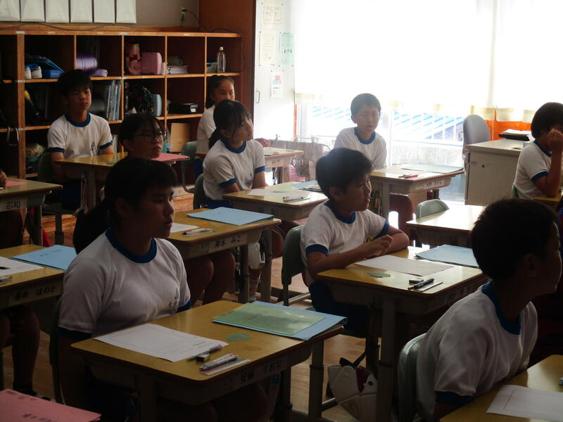 26日は5、6年生が平和学習を行いました。今回は講師として「平和をつなぐ会」の4名の方々をお迎えして行いました。最初に自己紹介をしていただいた後で、「皆さんにとっての幸せとは何ですか」という質問がありました。子供たちは自分にとっての幸せをそれぞれ発表していました。その後、世界では戦争が起こっていること、太平洋戦争のこと、回天の訓練の地の話しをしてくださったあとに、梅ヶ浜で実際に起こった空襲の話しを紙芝居形式でしてくださいました。子供たちは身近で起こった悲惨な出来事に驚いていました。子供たちは11月に修学旅行で知覧特攻平和会館に行きます。今回の学習を見学の際に思い出してもらえればと思います。