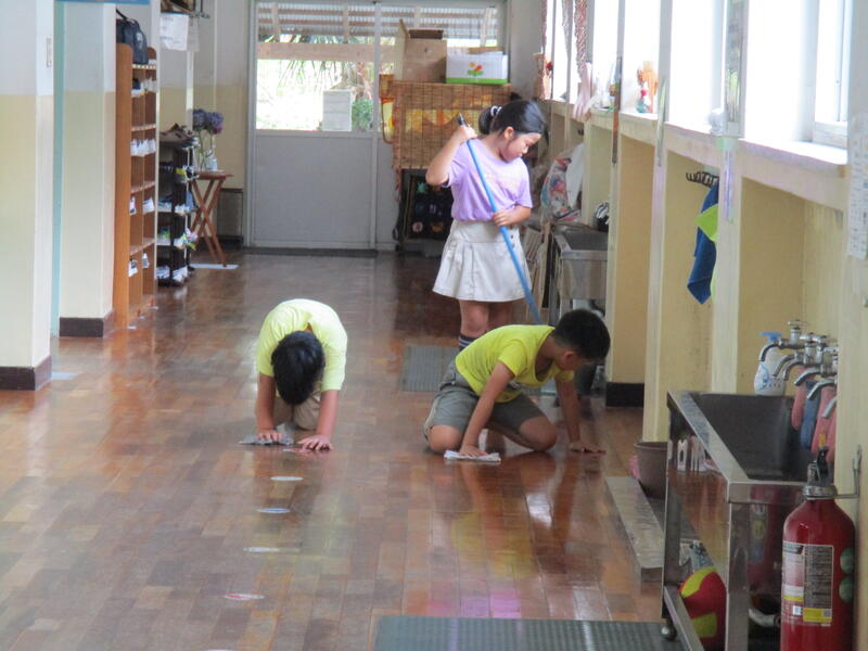 25日は朝の清掃活動の日でした。子供たちは時間がきたらすぐに自分の担当場所に移動して、自分達で考えながら汚れている場所をほうきで丁寧に掃いたり、雑巾で拭いたりしていました。限られた時間で、しかも人数が少ない中での清掃ですから担当場所をきれいにするためには、丁寧に清掃しながらも同じ場所をいつまでも清掃するわけにはいきません。ですからいかに効率よく、集中しながら清掃していくのかが鍵になっています。それが実践できていた時間だったと思います。