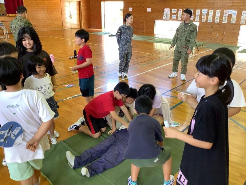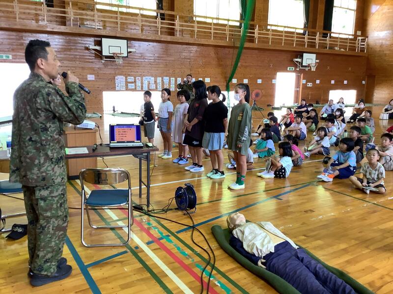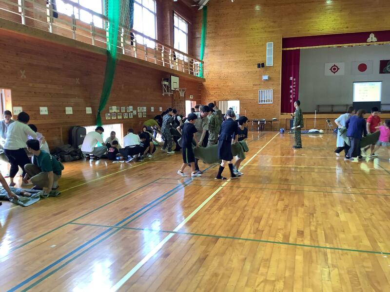 27日の参観日の3校時目は、全学年の児童と保護者が体育館に集合して学校保健委員会を行いました。目的は防災についての研修を深め、災害への備えについて基本的な知識等を身に付けることです。自衛隊宮崎地方協力本部日南地域事務所から5名の方を招いて災害への備えや毛布を使って担架を作成し搬送するという活動をしていきました。保護者の皆さんと協力しながら子供たちも真剣に取り組んでいたと思います。自衛隊の災害派遣地での活動の様子もよく分かる学校保健委員会でした。