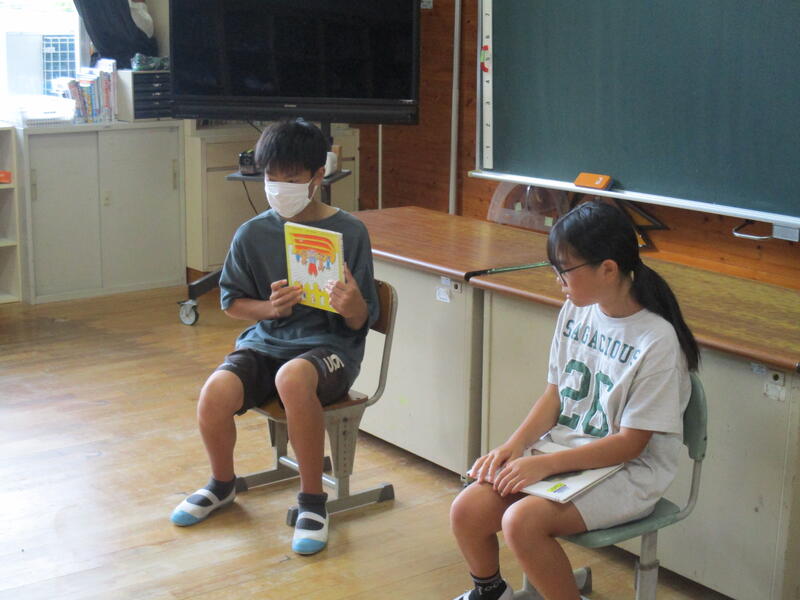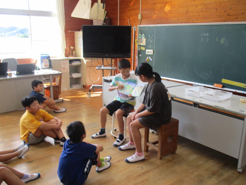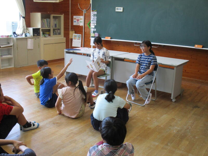 17日に生活委員会による図書活動の一環として、児童による読み聞かせが行われました。今回も委員会の児童が自分達で選書して、委員会の時間を中心に読み聞かせの練習をしていました。読み聞かせ当日は、聞く側の子供たちは自分達で場のセッテイングを行い、読む側の子供たちは、読むスピードや声の大きさに注意しながら絵本を読んでいました。前回も上手でしたが、今回はより上手に読むことができていました。