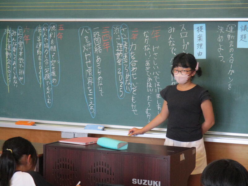 9日の6校時は代表委員会でした。今回の代表委員会では、10月26日に実施される運動会のスローガンを決めるというものでした。スローガンについては、事前に1年生から6年生の各学級でスローガンに入れたい言葉は何なのかを話し合って候補を出してもらいました。それを、代表委員会で話し合ってひとつのスローガンを作っていくのです。どの言葉も運動会に対する子供たちの思いが込められていてとても素晴らしいものでした。決定したものにつきましては、後日、お知らせします。