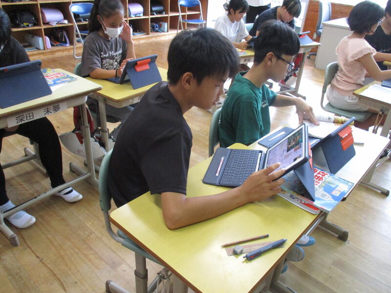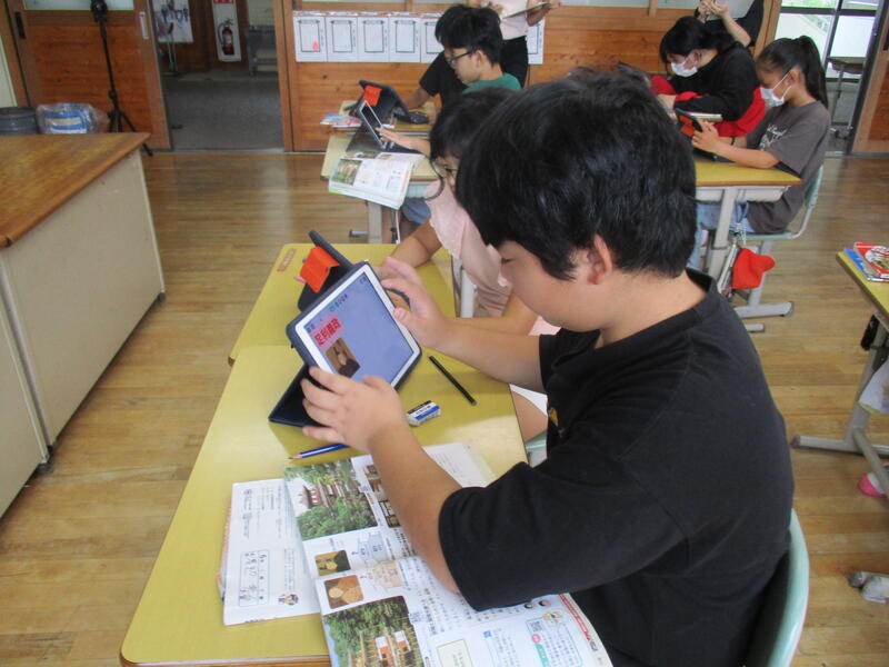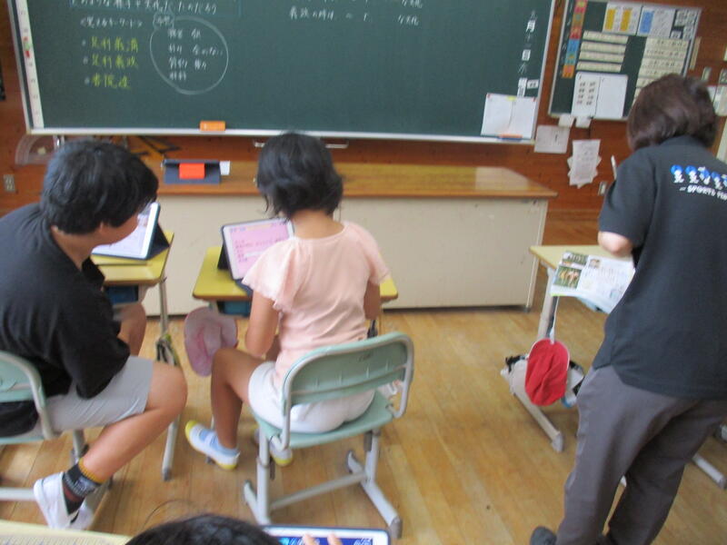 2日の日は2校時、3校時に細田小学校、大窪小学校、大堂津小学校の5、6年生が集まって集合学習を行いました。この学習では11月に予定されている修学旅行の班別研修で、どこにどのような順序で行くのかを決めるものです。行く場所の候補は黎明館、メルヘン館、博物館、美術館、護国神社等です。子供たちは、タブレット、パンフレットを使って、移動時間やどのような場所なのかを調べながら行程表を作っていきました。子供たちが修学旅行を楽しみにしていることが伝わってきます。