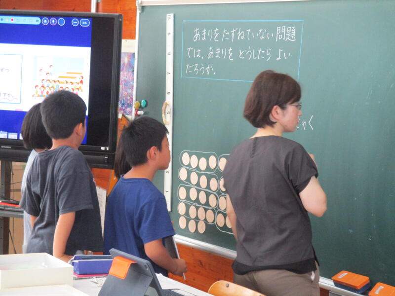 12日に3年生の算数の研究授業を行いました。単元は「あまりのあるわり算」です。内容は、35人の子供が4人がけの長椅子に座ると長椅子は何脚必要になるのかという問題です。子供たちは、図を使って説明したり、8脚でなく9脚になることを言葉で説明したりしていました。どの子供も自分の考えを他の子供たちに理解してもらおうと工夫をしていたと思います。相手を意識した説明ができていました。