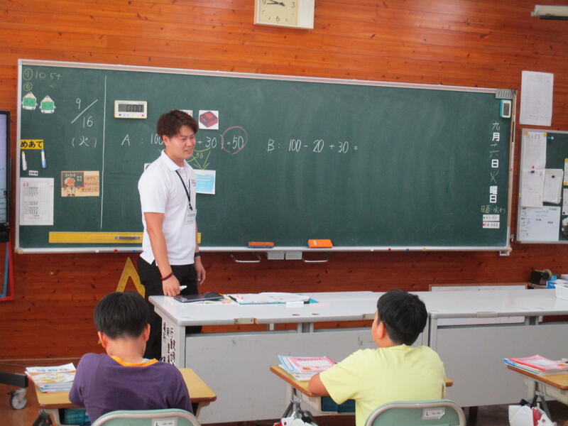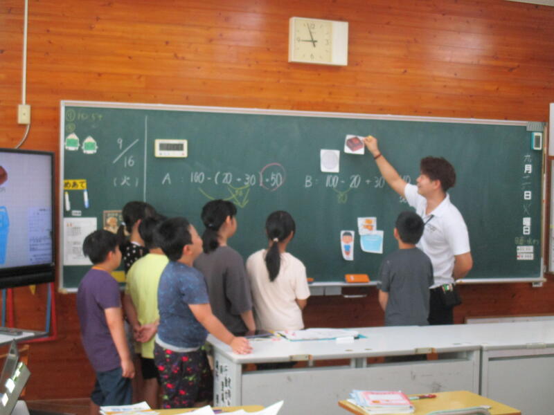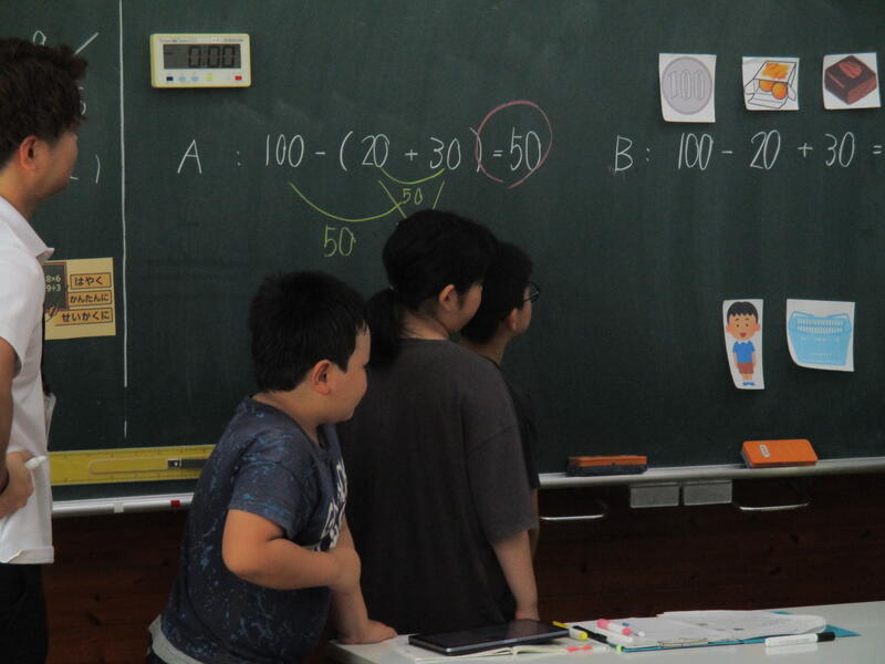 16日は4年生の研究授業が1時間目に行われました。教科は算数で、式と計算の順序について考えていくものです。今回は( )を使って1つの式に表して計算する学習でした。授業の中では、100円を持って買い物に行って、20円のガムと30円のチョコレートを買ったときのおつりはいくらか。という問題で、( )を買い物かごとイメージして100円から(20円のガム+30円のチョコレート)を引いた残りの50円がおつりというように説明していました。どの子供たちも真剣に立式の理由を考えていました。
