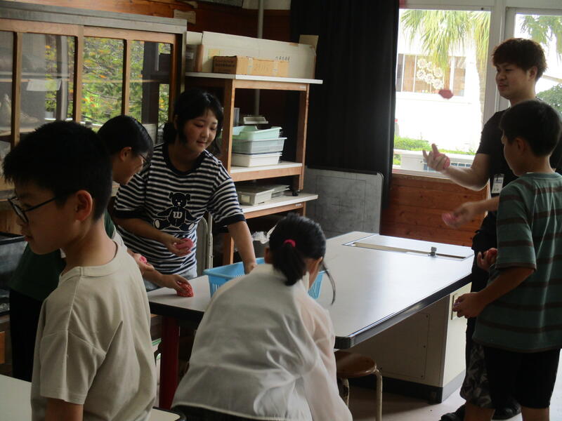 15日に1年生が生活科の「なつのあそび」の学習でシャボン玉の液を自作して、飛ばす学習をしました。シャボン玉液は、水、洗濯のり、台所用洗剤、ガムシロップを混ぜて作りました。子供たちはできるだけ大きなシャボン玉を作ろうと一生懸命にチャレンジしていました。大きくて丈夫なシャボン玉を作るのはとても難しかったのです。子供たちが思っていた大きさではないかもしれませんが、何度も作って楽しんでいました。