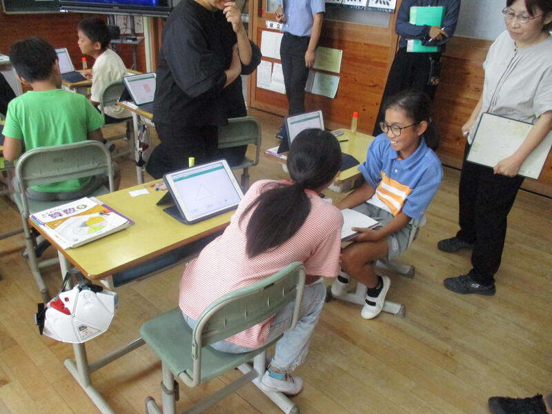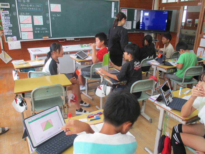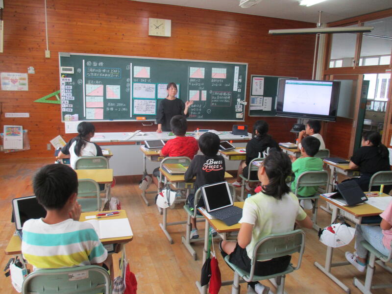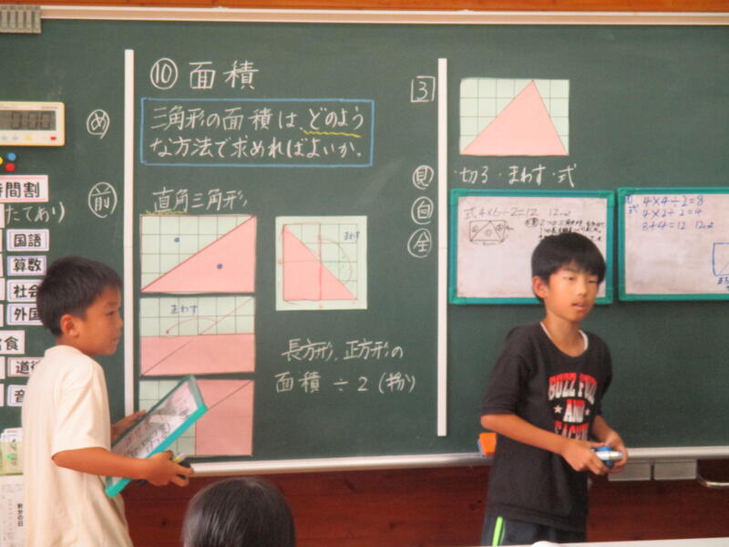 25日は5年生の研究授業が行われました。今回は算数の「面積」の学習で、三角形の面積をいろいろな求め方で考えていくというものでした。三角形の面積といっても前の時間に直角三角形の面積の求め方は学習しているので、今回はそれ以外の三角形の面積の求め方を学習しました。子供たちは、三角形を2倍にして長方形にして考えたり、三角形を切って長方形にしながら面積を求めていきました。自分で考えた解き方を友達に説明したり、全体の中で説明したりできていました。
