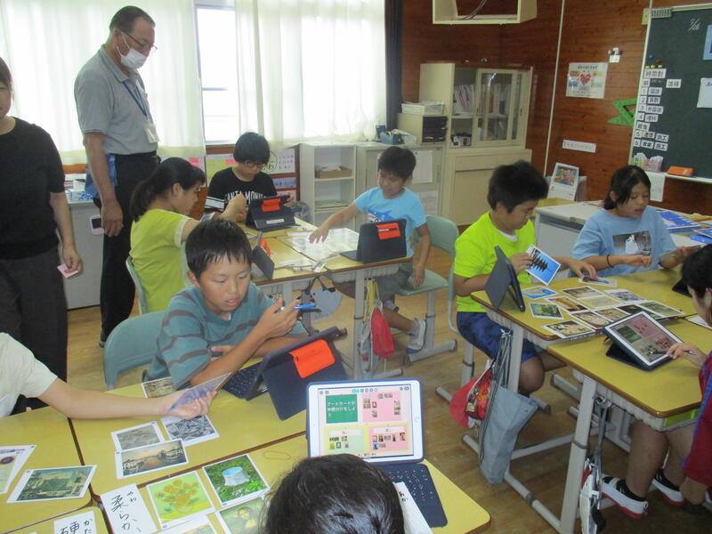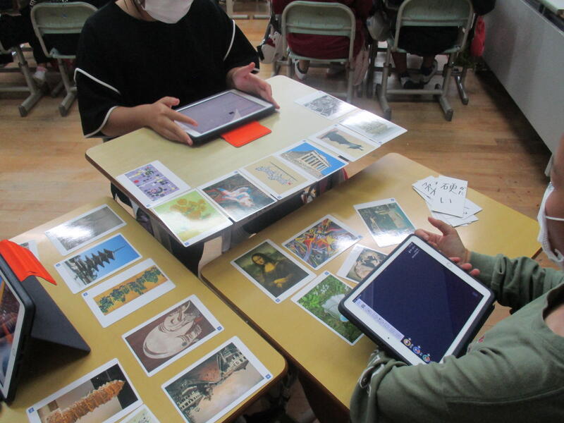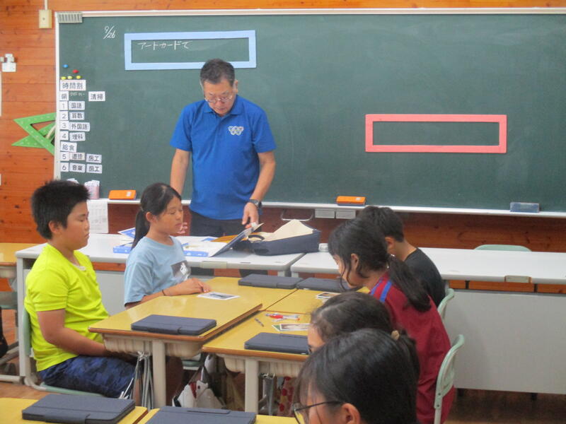 26日に5、6年生の図画工作の研究授業が行われました。題材は「作品と対話しよう」です。この学習では美術作品の写真が記載してあるアートカードを使って、例えば「明るい、暗い」、「軽い、重い」等のように仲間分けをしていきました。子供たちは自分のイメージをもとにしながらアート作品を分類していきました。子供たちは美術作品を分類していく中でその作品のもつ良さに気付いていったと思います。楽しそうな活動でした。