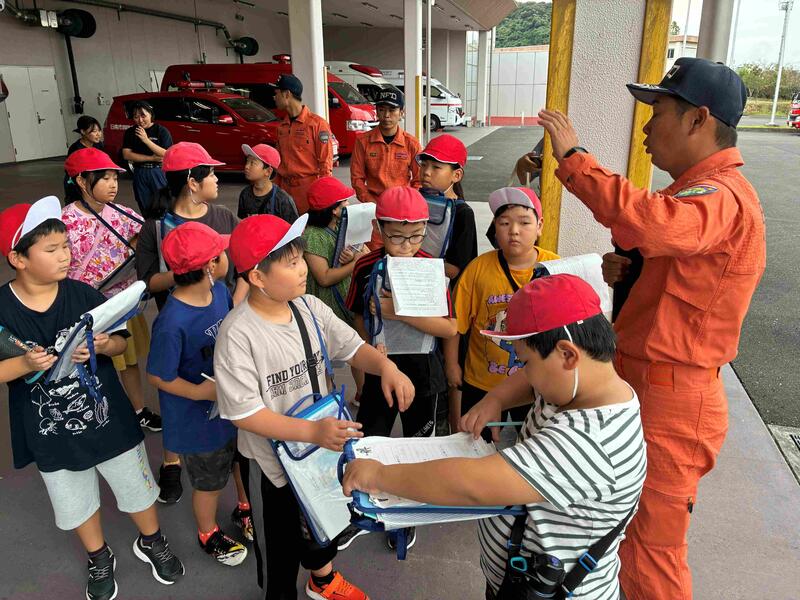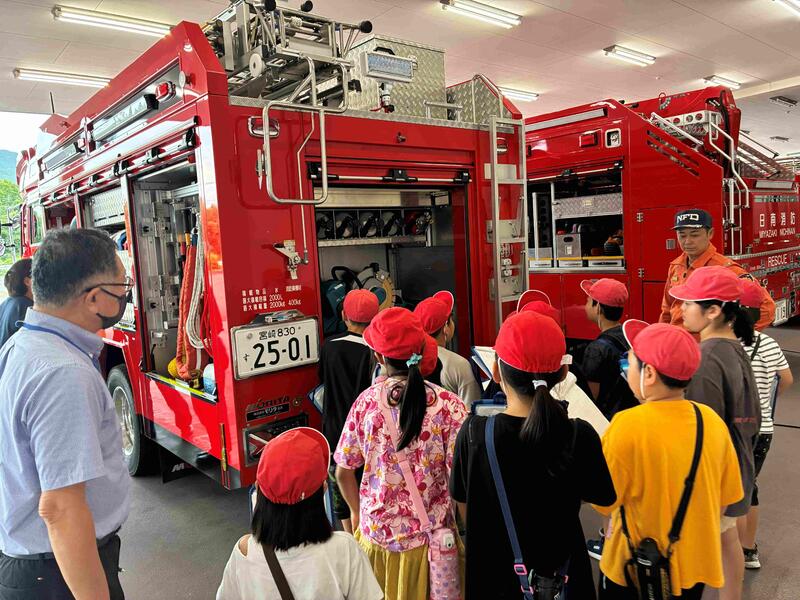 9月29日の午前中に3、4年生が日南警察署と日南消防署へ施設等の見学に行きました。警察署や消防署では施設や設備の工夫について調べたり、そこで働く人々の仕事内容や働いている様子を見学したりしました。子供たちは白バイに乗せてもらったり、放水訓練に参加させてもらったりしました。また、救急車の中も見せてもらいました。今回の見学を通して、警察署、消防署で働く人々の仕事の大切さや大変さをより感じることができたと思います。