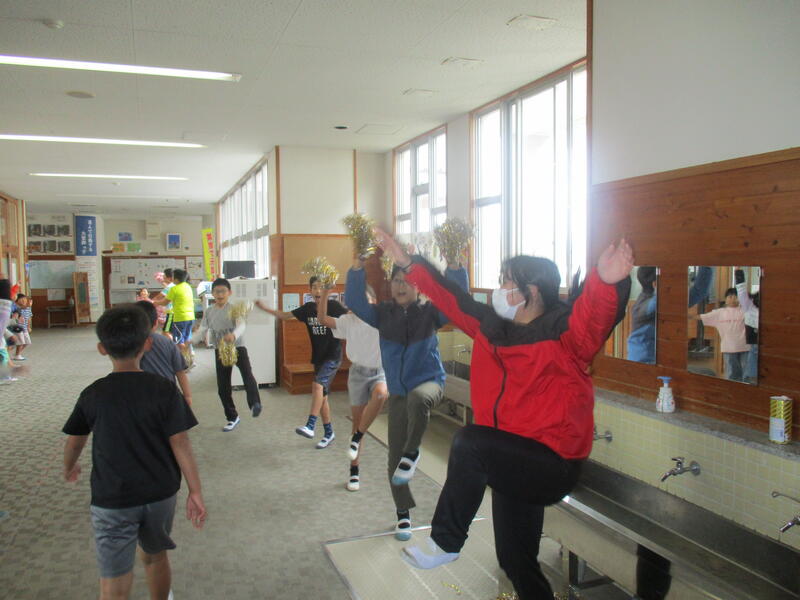 23日の昼休みは運動会前、最後の昼休み時間でした。赤、白団の応援リーダーの子供たちは1階の廊下に集合して1、2年生に各団の応援を教えていました。両団とも非常に大きな声で、大きな動きをしながら応援を頑張っていました。応援にやらされている感は全くなく、笑顔で楽しそうに取り組んでいたことが印象的でした。これが運動会前の最後の応援練習になると思いますが、満足いく練習だったと思います。当日が非常に楽しみです。