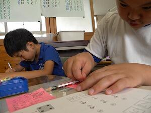 今日の「えがおタイム」は、6月生まれのお友達に、誕生日メッセージを書く時間でした。縦割り班ごとに各教室に集まり、お友達のことを思い返しながら熱心に書いていました。