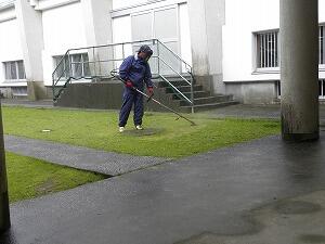 大堂津小学校の職員以外に、学校の環境を整えてくださる方がいます。細田地区全体の学校のお世話をしており、今日は、大堂津小中庭の草刈りをしていただいております。