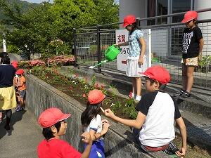 グリーンタイムでは、草花を育てる活動を行い、植物を大切にする心をもたせようと実施しています。今日は、各学年や浜っ子班の花壇に苗を植えていきました。