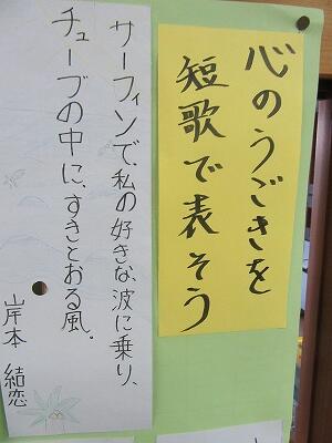 5年生は、「心の動きを短歌で表そう」というテーマで、短歌作りに取り組みました。子ども達それぞれの作品が、廊下に掲示してあります。その中で、岸本結恋さんの作品が、油津キャナルマルシェ俳句・短歌作品展の小中学校短歌の部で、見事に一席となりました。