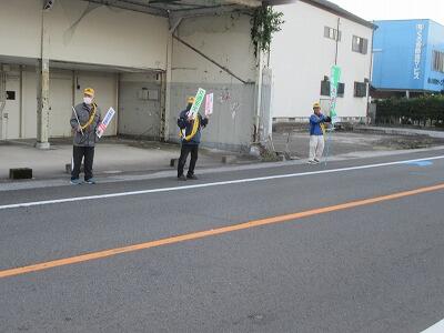 JR大堂津駅前で、細田地域づくり協議会、交通安全協会、自治会、高齢者クラブ、警察等、約30人が参加して、のぼり旗やハンドプレートを掲げ、運転者への安全意識の啓発を行いました。学校代表として、細田中と大堂津小の校長が参加しました。