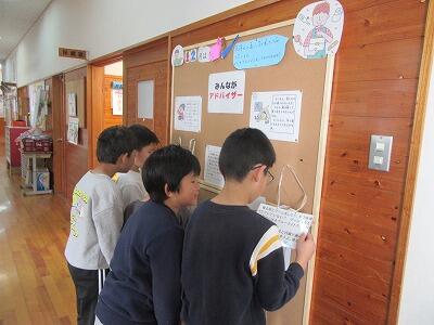 12月の保健室の掲示は、「みんながアドバイザー」です。掲示板には「冬休みの過ごし方で困っている人が5人います。どんなアドバイスをしてあげられるかな?」との問いかけがあり、風邪をひかないようにするにはどうすれば良いか、年末年始に食べ過ぎないようにするにはどうすれば良いか等の、5つのシチュエーションでのアドバイスが求められています。さて、子ども達は、上手にアドバイスをすることができるでしょうか。