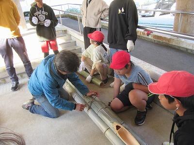 17日の5・6校時に、5・6年生は門松づくりを行いました。昨年度までは、PTA番屋塾の方々と学校の職員で実施していましたが、本年度は児童を交えての門松づくりを実施しました。当日は、大内PTA会長及び河野塾長と地域の方々を講師にお招きしました。まず、門松に使用する竹切りからでした。講師の方々の御指導の下で、みんなで力を合わせて、鋸で竹を切りました。子ども達は、まっすぐに鋸を引くのに苦労していましたが、何とか必要数分の竹を切ることができました。その後は、校門に移動して、砂入れや飾り付けを行い、立派なきれいな門松が完成しました。最後に完成した門松をバックに記念撮影を行いました。日本の伝統である門松づくりを体験して、子ども達は、とても満足そうでした。