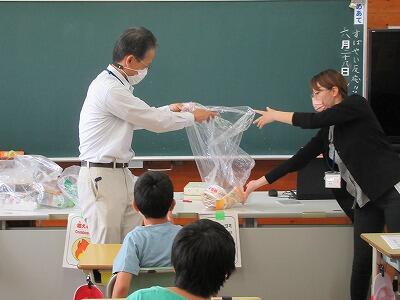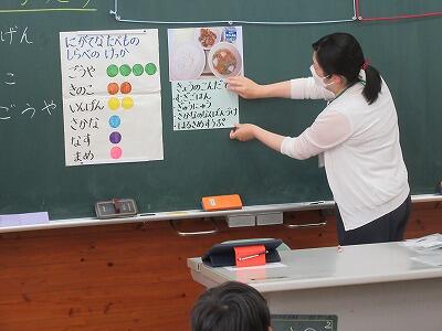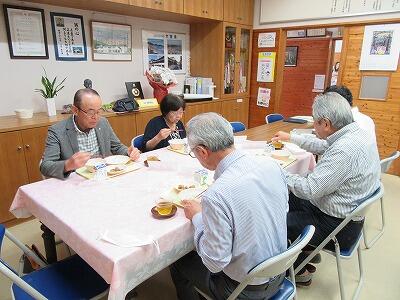 いくつかの食材を試食しながら人間には、五感(視覚、聴覚、味覚、嗅覚、触覚)と五味(甘味、塩味、酸味、苦味、うま味)が備わっていること、それが年を重ねるにつれて鈍くなっていくこと、うま味は日本から生まれた言葉であること等を学習しました。五感と五味を活用して味わって食べることの大切さも知りました。最後にお土産の明月堂のどら焼きをおいしそうに食べていました。