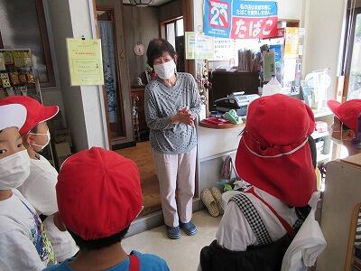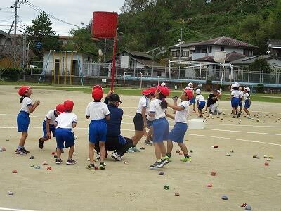 最初に、事前に作成した手作りのおもちゃを披露して、一緒に遊びました。子ども達は優しく遊び方を教えてあげていました。次に運動会の時のダンスの披露し、アサガオの種をプレゼントしました。保育所の子ども達はとても喜んでくれました。最後に保育所の子ども達から折り紙の手裏剣をプレゼントされました。