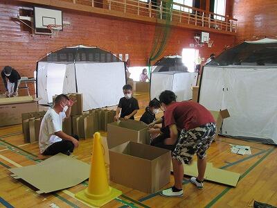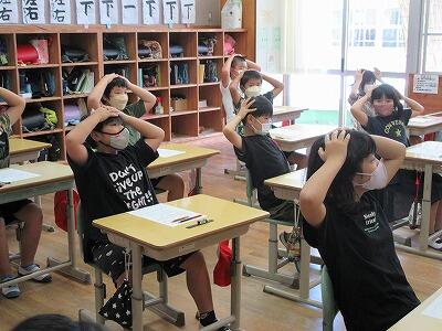 教室で机の下にもぐり身を守った後、速やかに防災ずきんをかぶり