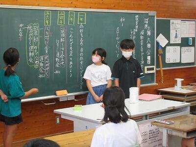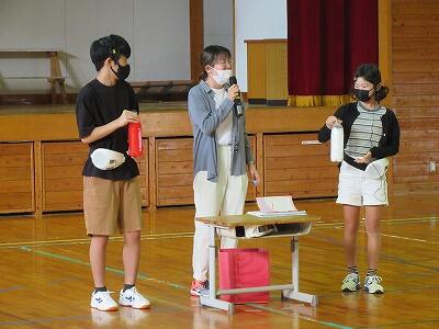 最初に夏休みに行われた「未来へつなぐ子ども議会」に参加できなかった6年生の蛯原蓮太さんの議会への答弁を全校児童の前で行いました。