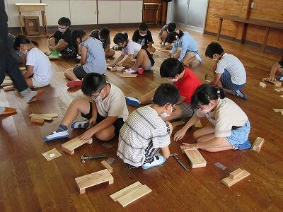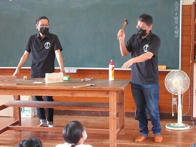 14日に、3・4年生は日南市の谷材木店の方々を講師でお招きして、森林環境教育の授業を実施しました。始めに飫肥杉の板を使って鉛筆立てを作製しました。金槌を使って釘を打って固定していく作業に苦労する姿が見られましたが、友達と教え合いながら、全員鉛筆立てを完成することができました。
