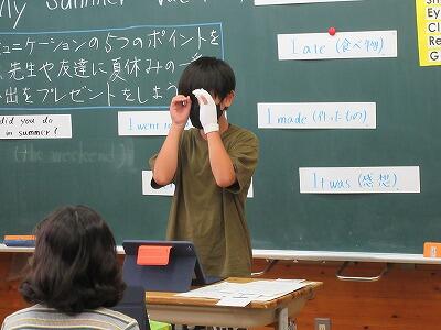 26日に6年生は外国語科の授業で、夏休みの思い出発表会を行いました。6年生それぞれの思い出について、身振り手振りを加えることやクリアボイスで話すこと等のポイントを踏まえながら、1人ずつ発表を行いました。子ども達はオールイングリッシュでの発表だったので、かなり緊張したようですが、しっかりとした口調で、身振り手振りを交えながら笑顔で発表することができました。